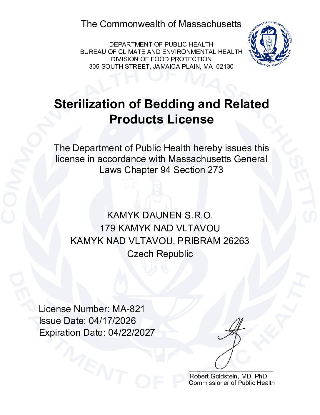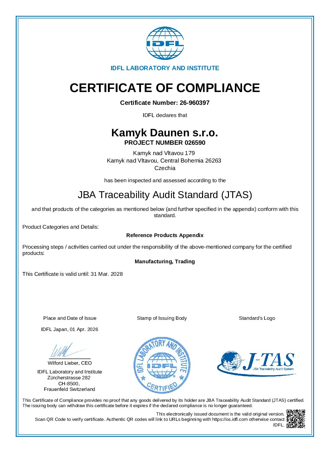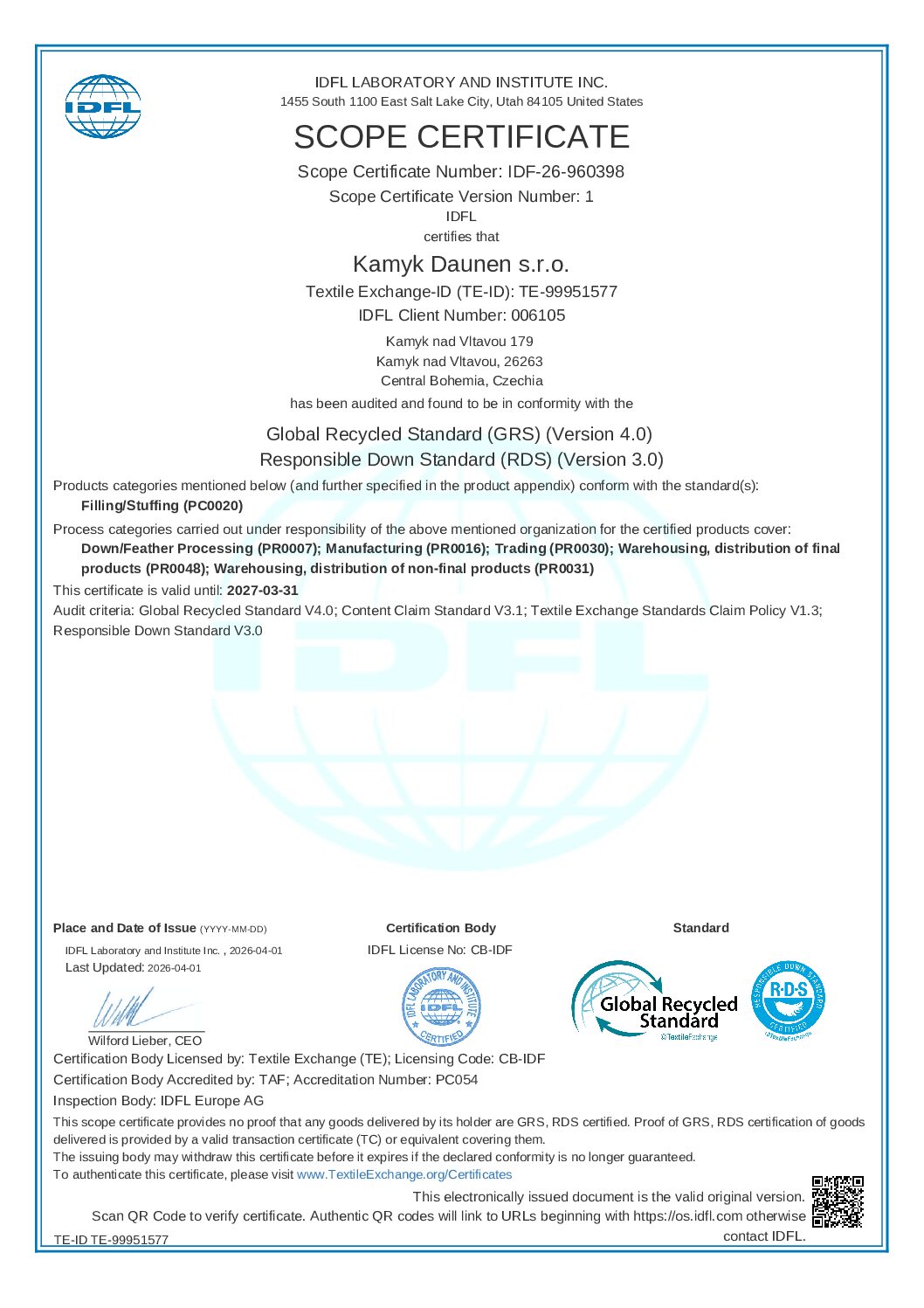 Společnost Kamýk Daunen prochází pravidelně řadou prestižních certifikací. Za ty nejzásadnější lze považovat RDS, Downpass, ISO 9001, ISO 28000, Daunasan & Downafresh, Nomite, STANDARD 100 by OEKO-TEX® a další.