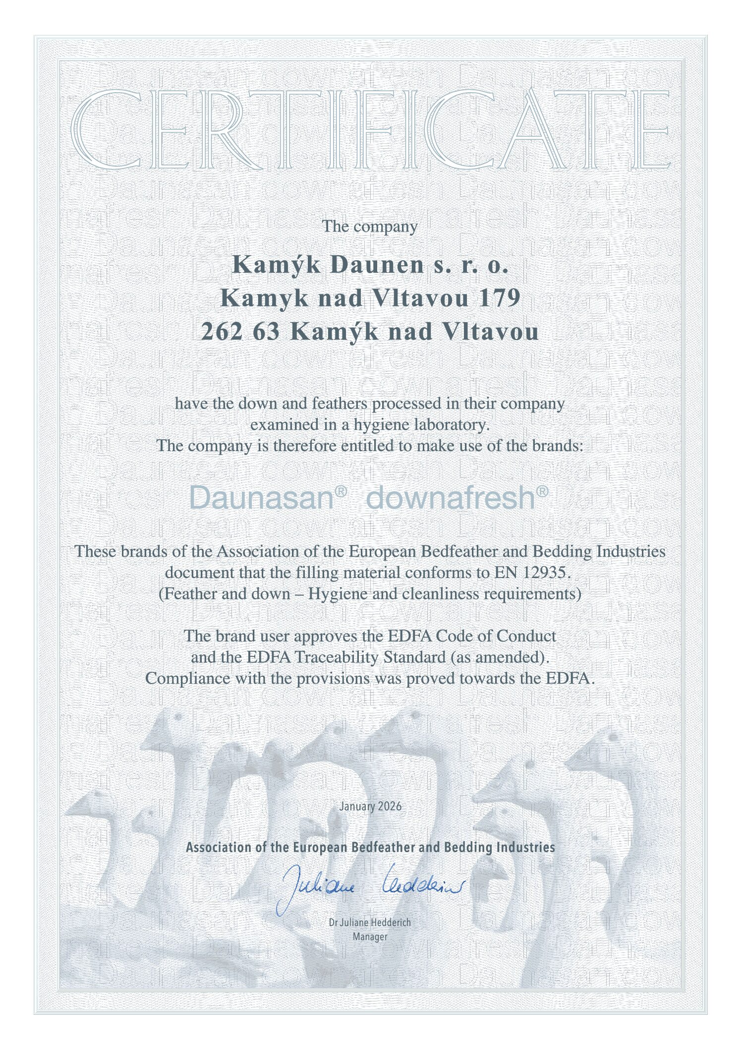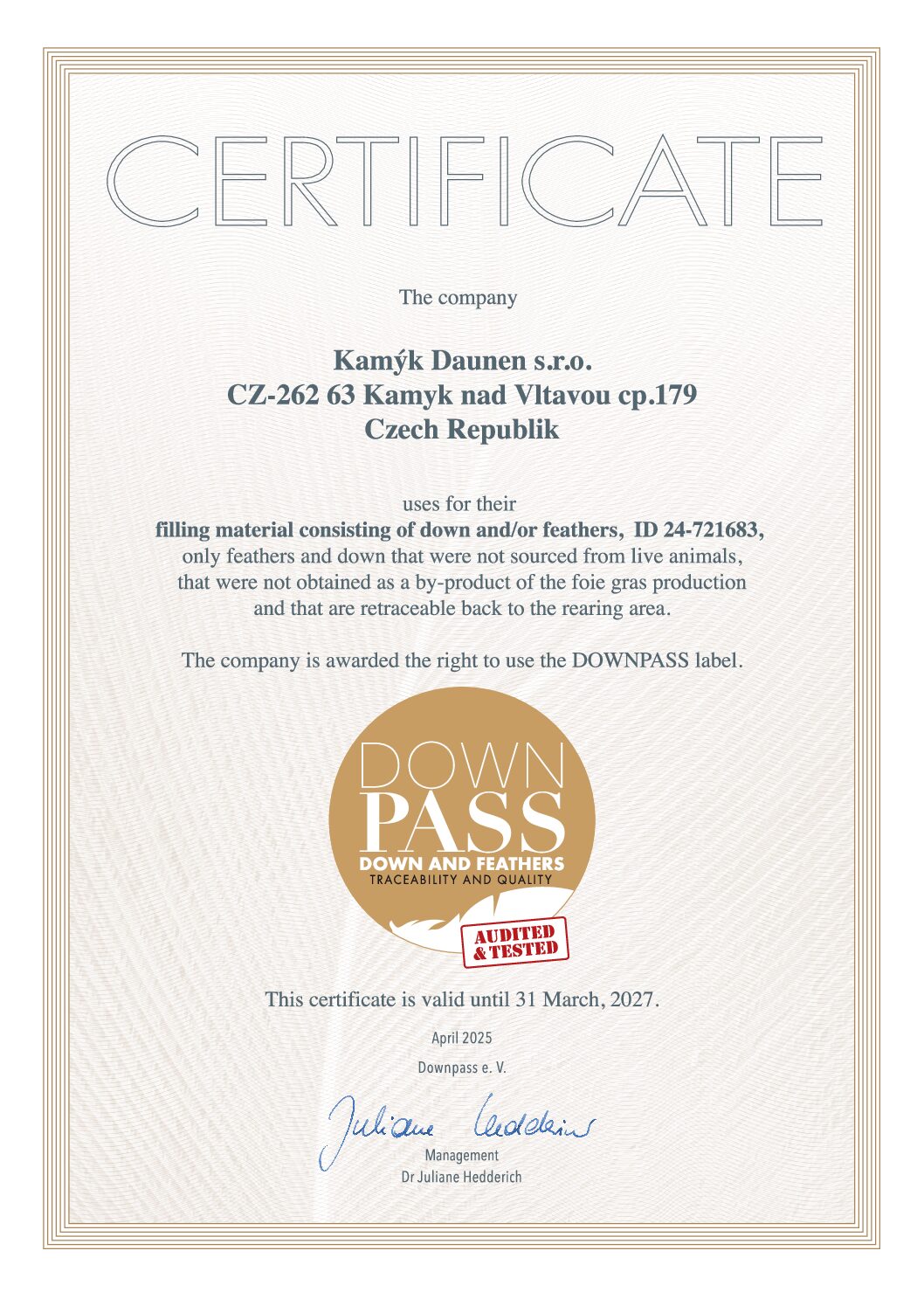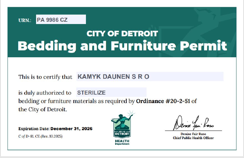 Společnost Kamýk Daunen prochází pravidelně řadou prestižních certifikací. Za ty nejzásadnější lze považovat RDS, Downpass, ISO 9001, ISO 28000, Daunasan & Downafresh, Nomite, STANDARD 100 by OEKO-TEX® a další.