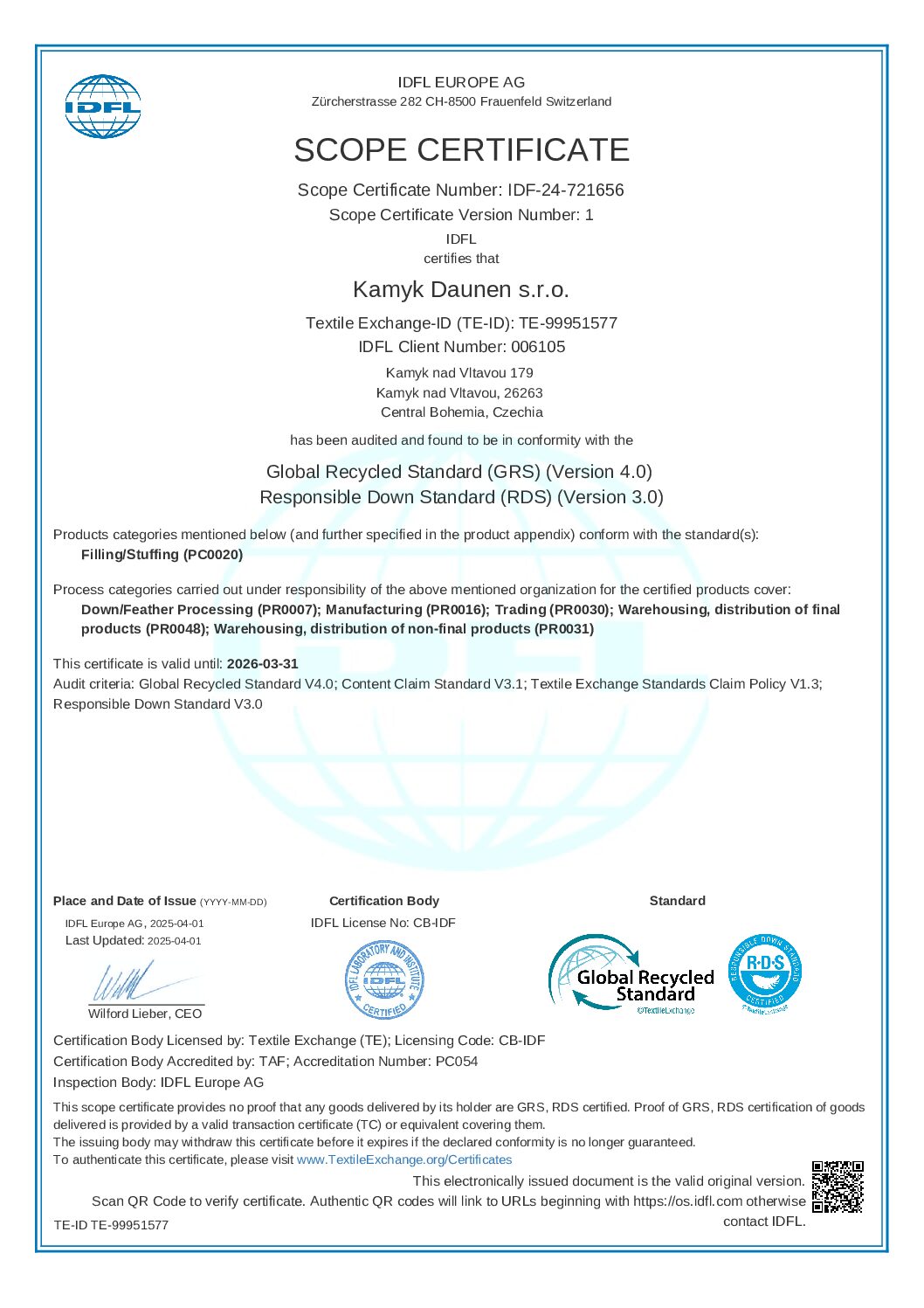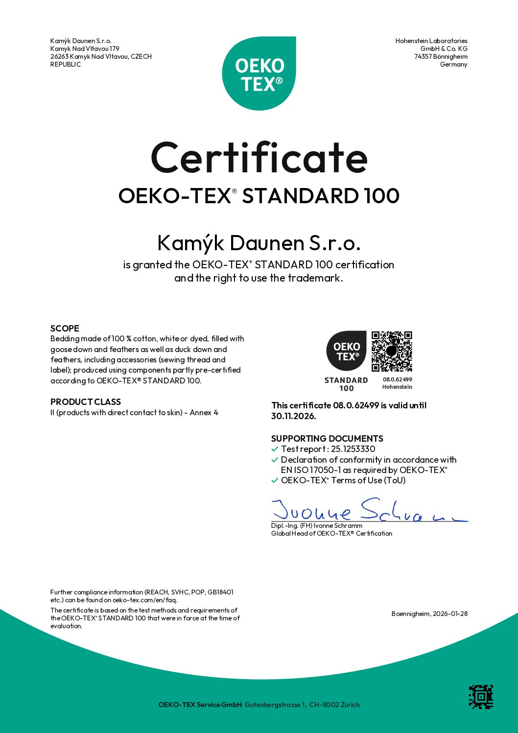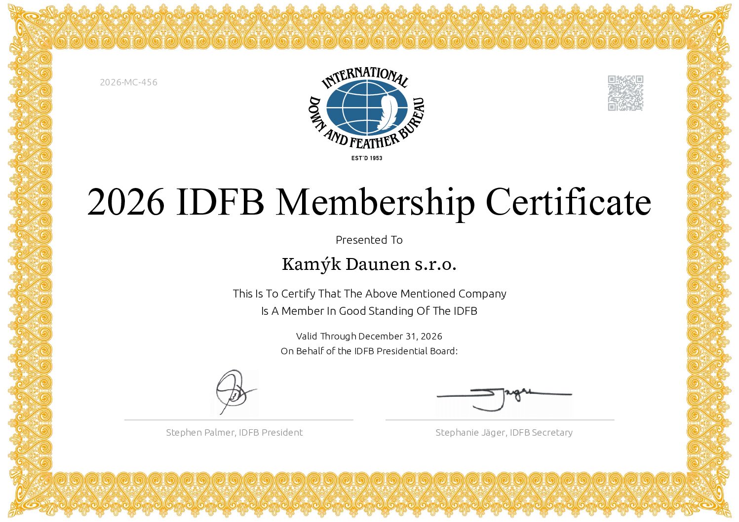 Společnost Kamýk Daunen prochází pravidelně řadou prestižních certifikací. Za ty nejzásadnější lze považovat RDS, Downpass, ISO 9001, ISO 28000, Daunasan & Downafresh, Nomite, STANDARD 100 by OEKO-TEX® a další.